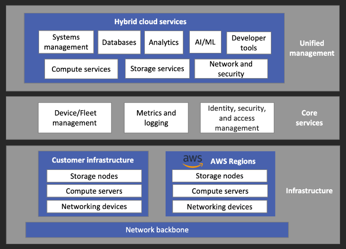 AWS でのハイブリッドクラウド は、クラウドからオンプレミス、そしてエッジまで、必要な場所で一貫した AWS エクスペリエンスを提供します。当社は、包括的で広く採用されているクラウドコンピューティングプラットフォームを提供し、グローバルデータセンターから 200 を超えるフル機能のクラウドサービスを提供しています。コンピューティング、ネットワーキングとコンテンツ配信、ストレージ、セキュリティと ID、データ統合、管理、モニタリング、運用など、お客様固有の要件とユースケースに対応するハイブリッドアーキテクチャの構築を支援する多数のサービスがあります。